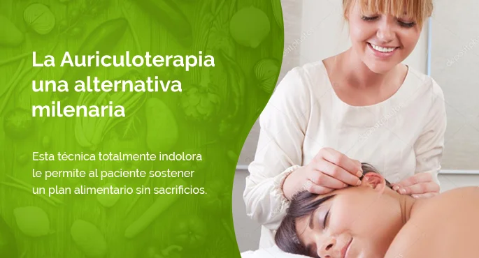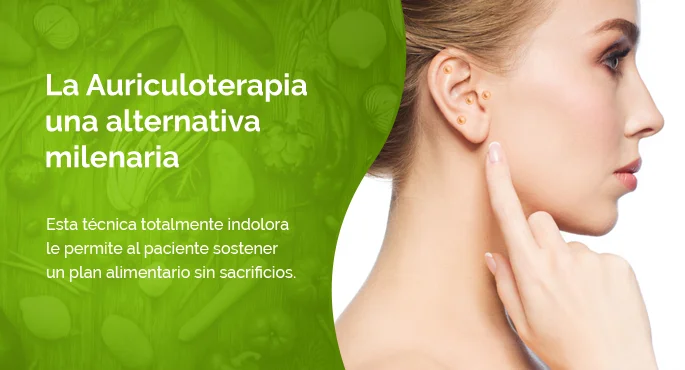 La auriculoterapia consiste en localizar y equilibrar diferentes puntos de acupuntura ubicados en el pabellón auricular. A continuación se aplican esferas milimétricas de acero inoxidable magnetizado en la oreja del paciente, para estimular el sistema digestivo, reducir el hambre, la ansiedad, el insomnio y otras enfermedades derivadas del estrés. Esta técnica totalmente indolora le permite al paciente sostener un plan alimentario sin sacrificios.